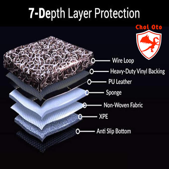 Thảm lót sàn ô tô 6D tiêu chuẩn sử dụng chất liệu da PU cao cấp tương tự như chất liệu may thảm 7D. Sự khác biệt dễ nhận biết đó chính là lớp cao su rối bên trên mặt lớp thảm da của thảm lót sàn ô tô 6D. Theo đó, cấu tạo của thảm lót sàn ô tô 6D bao gồm 6 lớp: